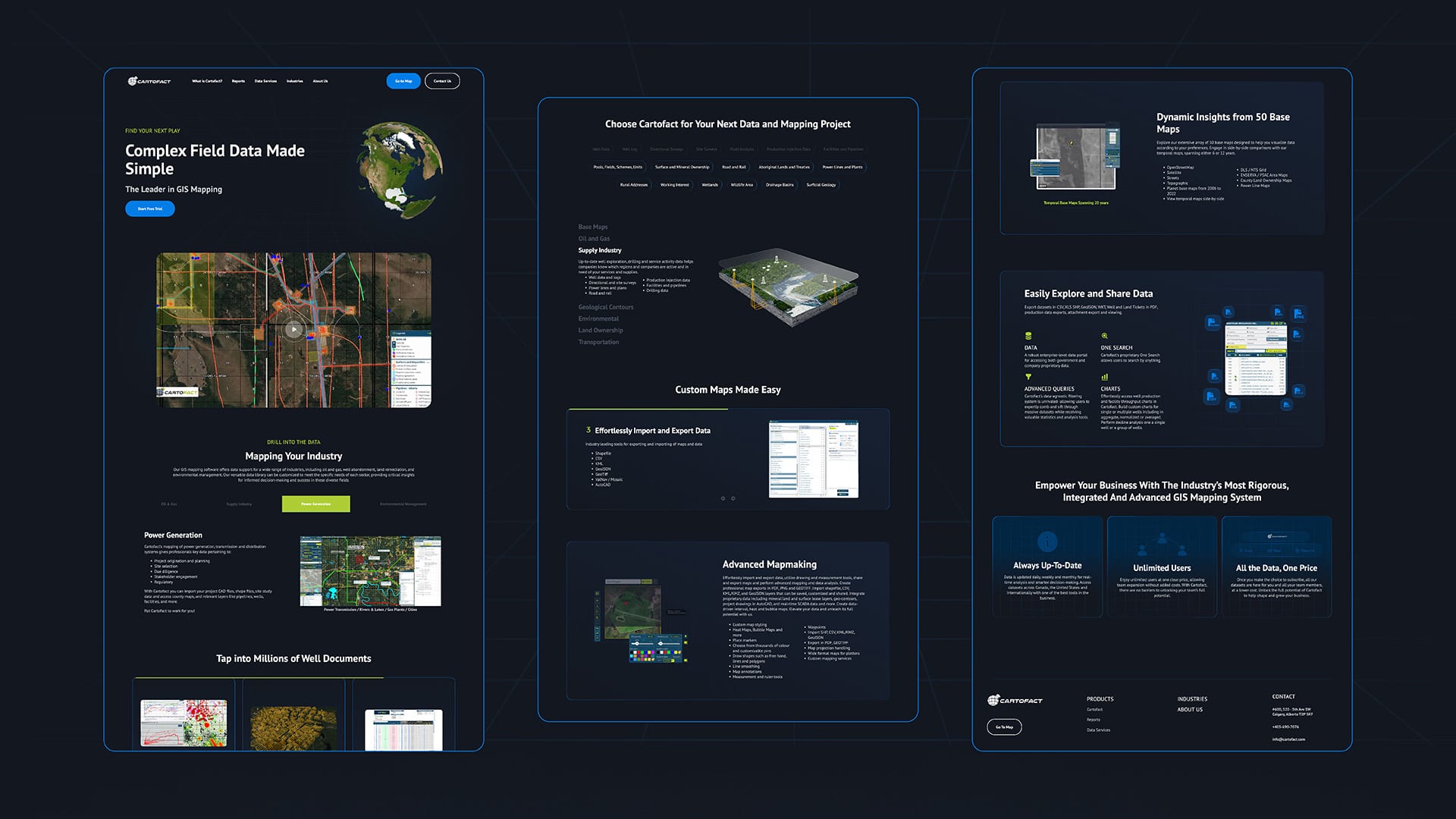 Tasked with translating their intricate backend mapping software into an intuitive web interface, I seamlessly integrated the concept of grids from maps into the website’s design. A key aspect of the project was showcasing Cartofact’s extensive data offerings, achieved through the creation of an interactive 3D topographic map. This dynamic feature allowed users to explore layers of information, including oil and gas reserves, environmental factors, land ownership details, and transportation routes, providing a comprehensive understanding at their fingertips. From the grid-inspired background to the user-friendly information boxes.