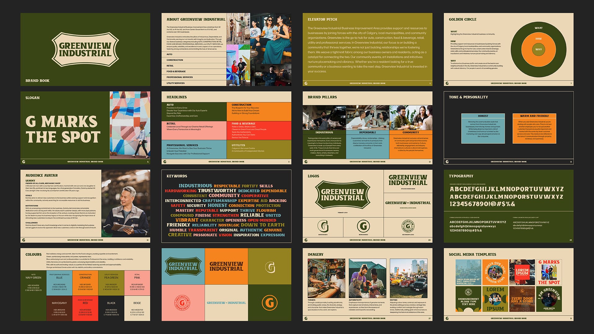 A comprehensive branding guide and logos were developed for Greenview Industrial, a vibrant business improvement area deeply rooted in community heritage. With a keen understanding of the area’s rich history and multi-generational spirit, I curated a brand identity that seamlessly integrated retro elements, paying homage to the area’s legacy. Both written brand elements and visual components captured the essence of community spirit, resonating with residents and businesses alike. To reflect the diversity of industries within the area, I devised an extensive colour palette, with each hue representing one of the six pillars of business.