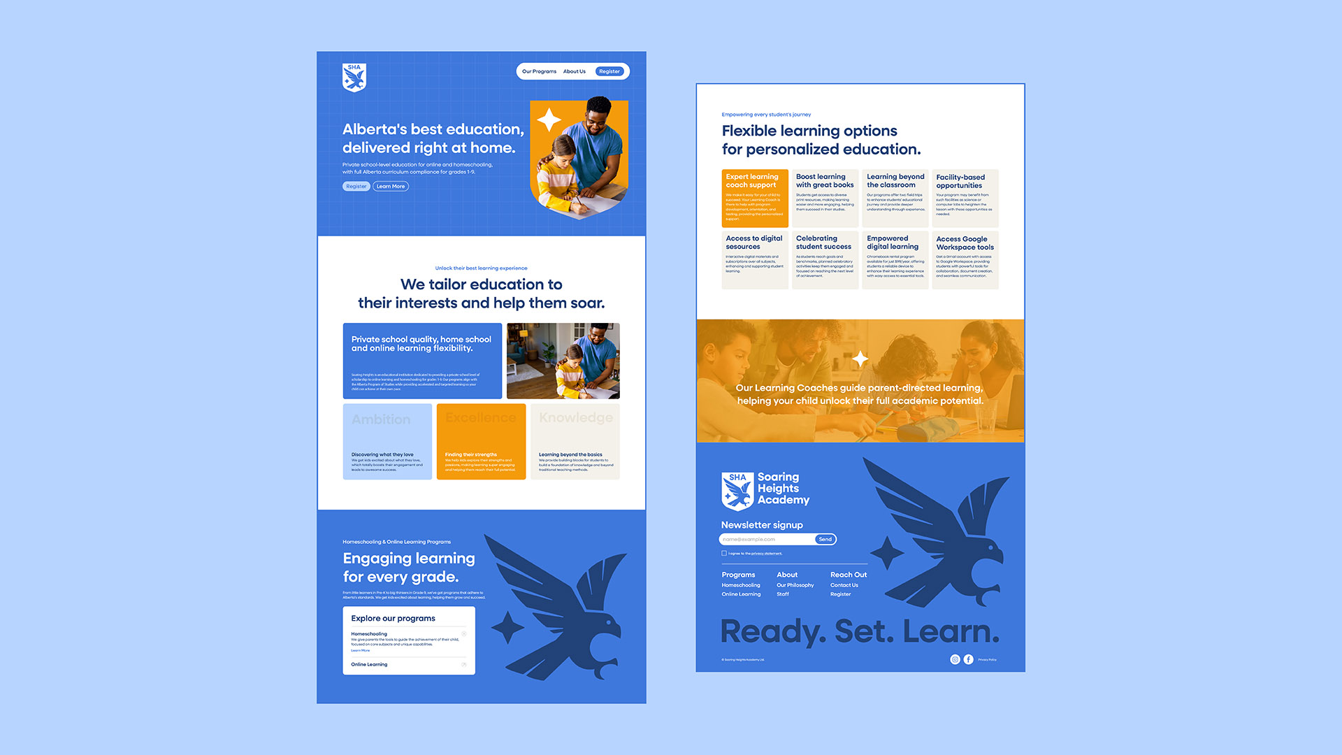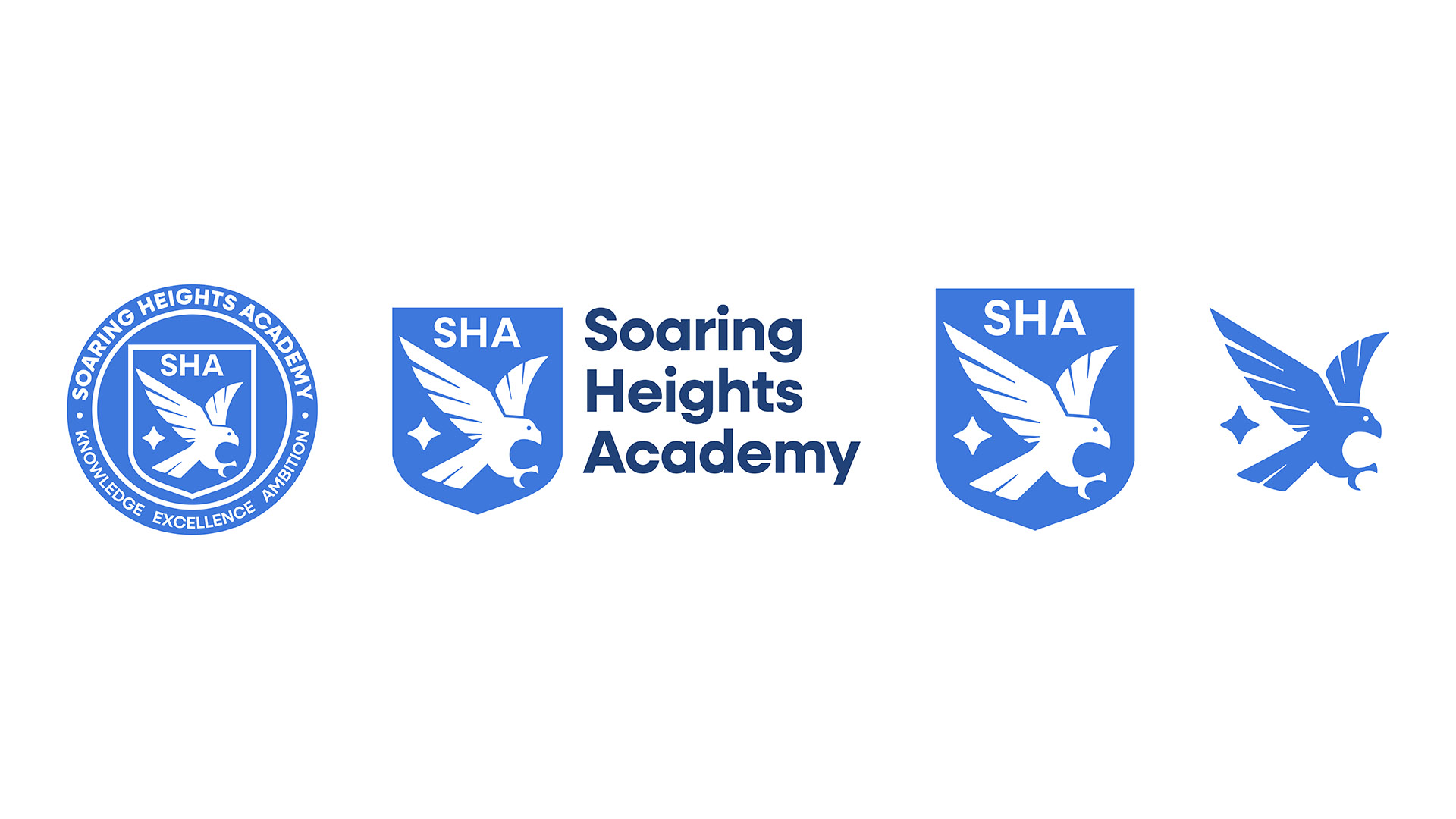 The brand and website were designed to reflect this forward-thinking approach — clean, modern, and approachable, with a focus on clarity and accessibility for both parents and students. I developed an adaptable logo system that could flex from a full badge to a simplified icon. The primary logo integrates the full name and core values of Soaring Heights Academy. From this foundation, I created a distilled icon mark—clean, geometric, and instantly recognizable—that can stand alone across smaller applications such as digital badges, social media, and mobile interfaces. This modular system ensures consistent brand recognition.